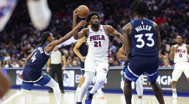 很難想象,這個(gè)在揭幕戰(zhàn)“隱身”的內(nèi)線,曾是聯(lián)盟最具殺傷力的得分機(jī)器。巔峰時(shí)期的恩比德,7次入選全明星,連續(xù)兩年蟬聯(lián)得分王,2023年斬獲MVP,2024年對(duì)陣馬刺時(shí)單場轟下70分18籃板5助攻的逆天數(shù)據(jù),創(chuàng)下現(xiàn)役內(nèi)線的得分紀(jì)錄。2023-24賽季受傷前,他場均出戰(zhàn)33.6分鐘能轟下34.7分,每分鐘得分超過1分——這樣的效率,NBA歷史上只有遠(yuǎn)古時(shí)期的張伯倫能做到。彼時(shí)的他,進(jìn)攻端兼具2米13身高的碾壓優(yōu)勢、華麗的低位腳步與穩(wěn)定的投籃手感,翻身跳投幾乎無人能干擾;一旦擠進(jìn)禁區(qū),總能用各種方式將球送進(jìn)籃筐,甚至練就了“碰瓷造犯規(guī)”的絕技,站上罰球線的次數(shù)堪比火箭時(shí)期的哈登。即便這種打法爭議不斷,卻沒人能否認(rèn)其高效——畢竟,能輕松得分的方式,從來都不丟人。